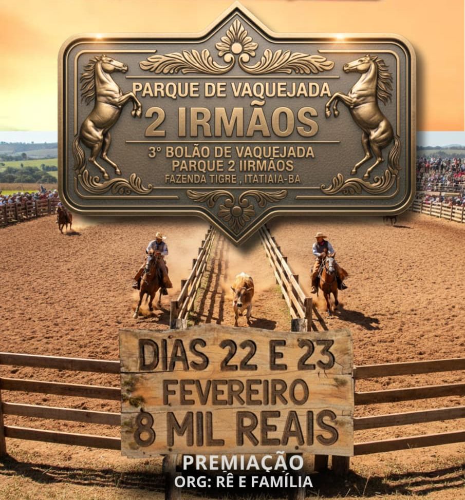 A emoção da vaquejada está de volta a Itatiaia, distrito de São José do Jacuípe (BA). Nos dias 22 e 23 de fevereiro, o Parque de Vaquejada 2 Irmãos será palco do 3º Bolão de Vaquejada, um evento que promete reunir os melhores competidores e amantes da tradição nordestina.