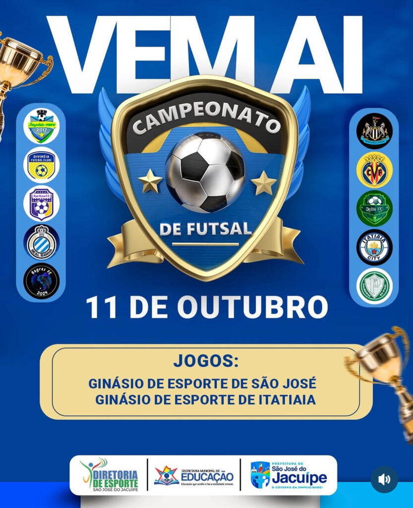 No próximo 11 de outubro de 2025, acontece o grande Campeonato de Futsal entre Itatiaia e São José do Jacuípe, organizado pela Prefeitura Municipal.