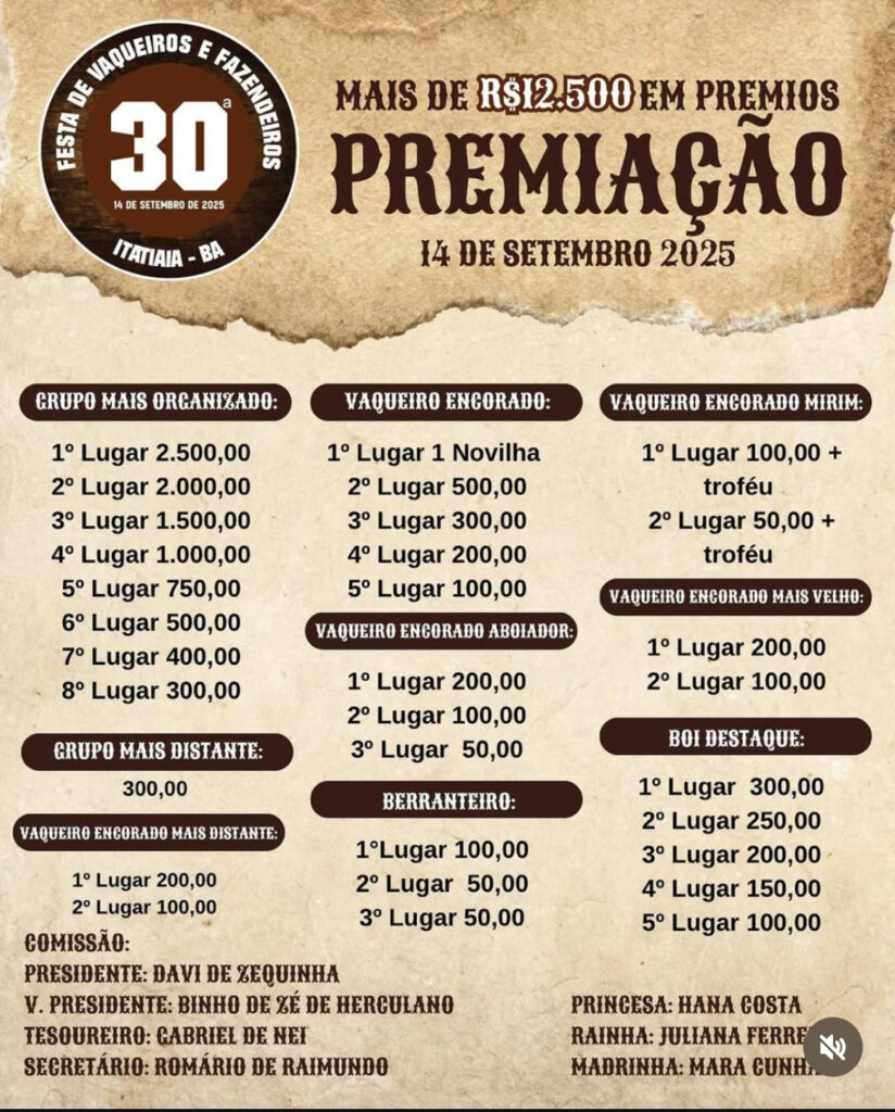 Ao longo dessas três décadas, o evento se consolidou como símbolo da identidade local, celebrando o trabalho dos vaqueiros e fazendeiros, que com dedicação e coragem ajudam a construir a história da nossa região. A programação contará com missa, cavalgada, apresentações culturais e atrações musicais que prometem animar moradores e visitantes.